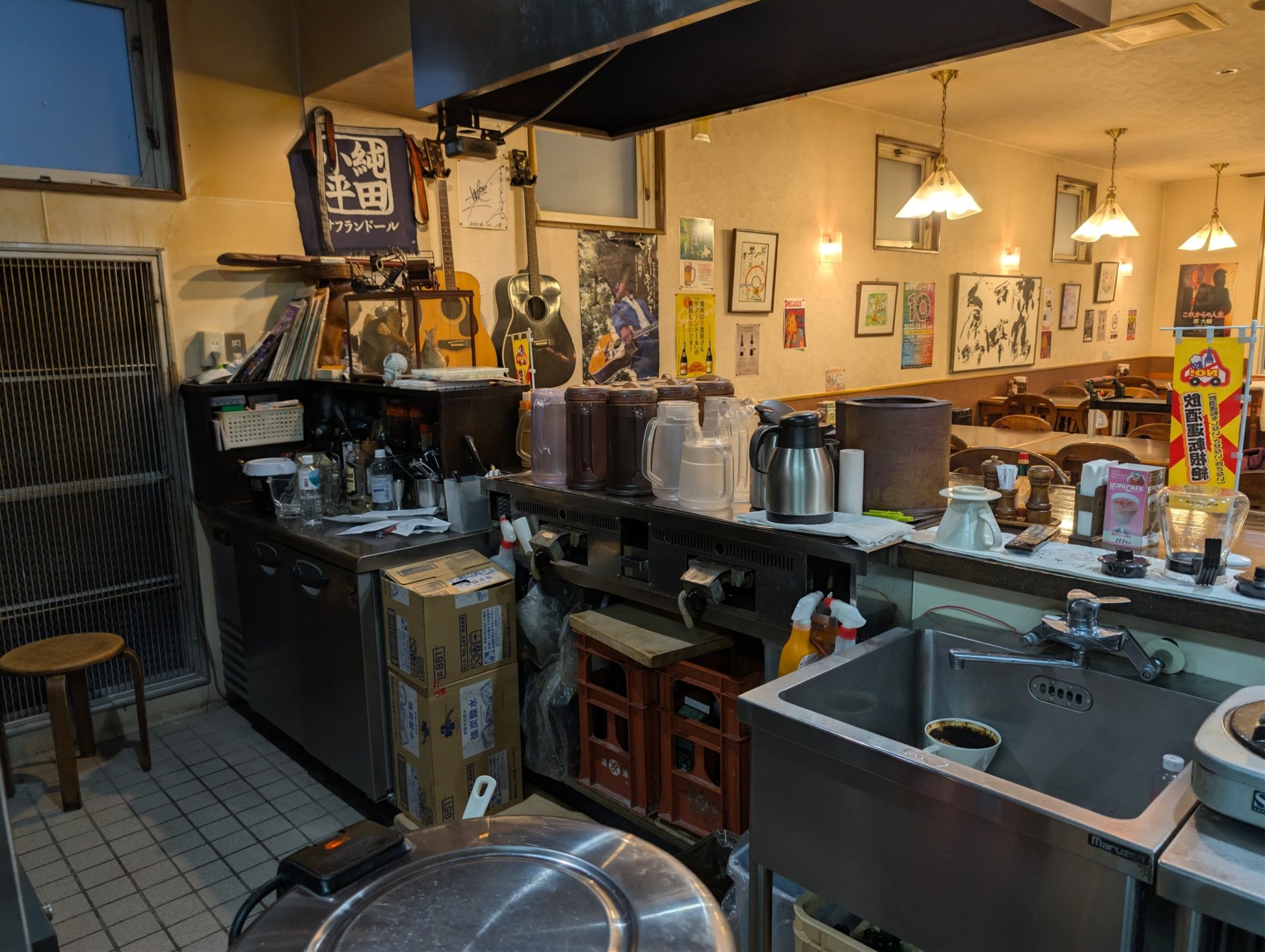 店内は約40坪の広さがあり、ホールにはカウンターとテーブル席を合わせて46席を備えています。厨房も約15坪とゆとりがあります。地下には約1坪の収納スペースも備えており、現在は冷凍庫や食品・食器棚を置いて使用しています。また、2階は住居として利用できます。