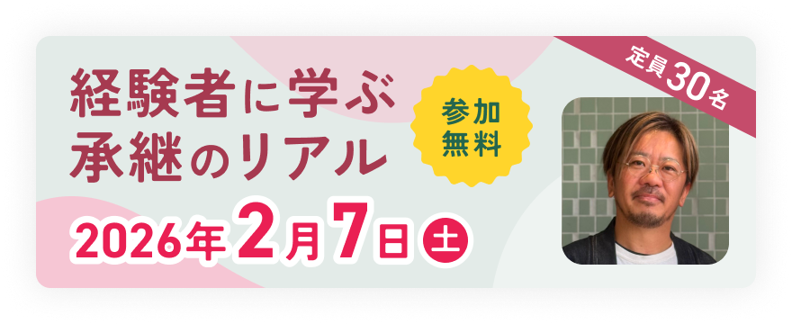 事業承継は、時代に合わせて新たな価値を生み出すきっかけにもなります。本セミナーでは、老舗銭湯「狛江湯」を三代目として承継し、リノベーションに取り組んできたゲストを迎え、承継後の工夫や挑戦を語ります。終了後には、ゲストや支援機関に相談できる交流会も開催します。